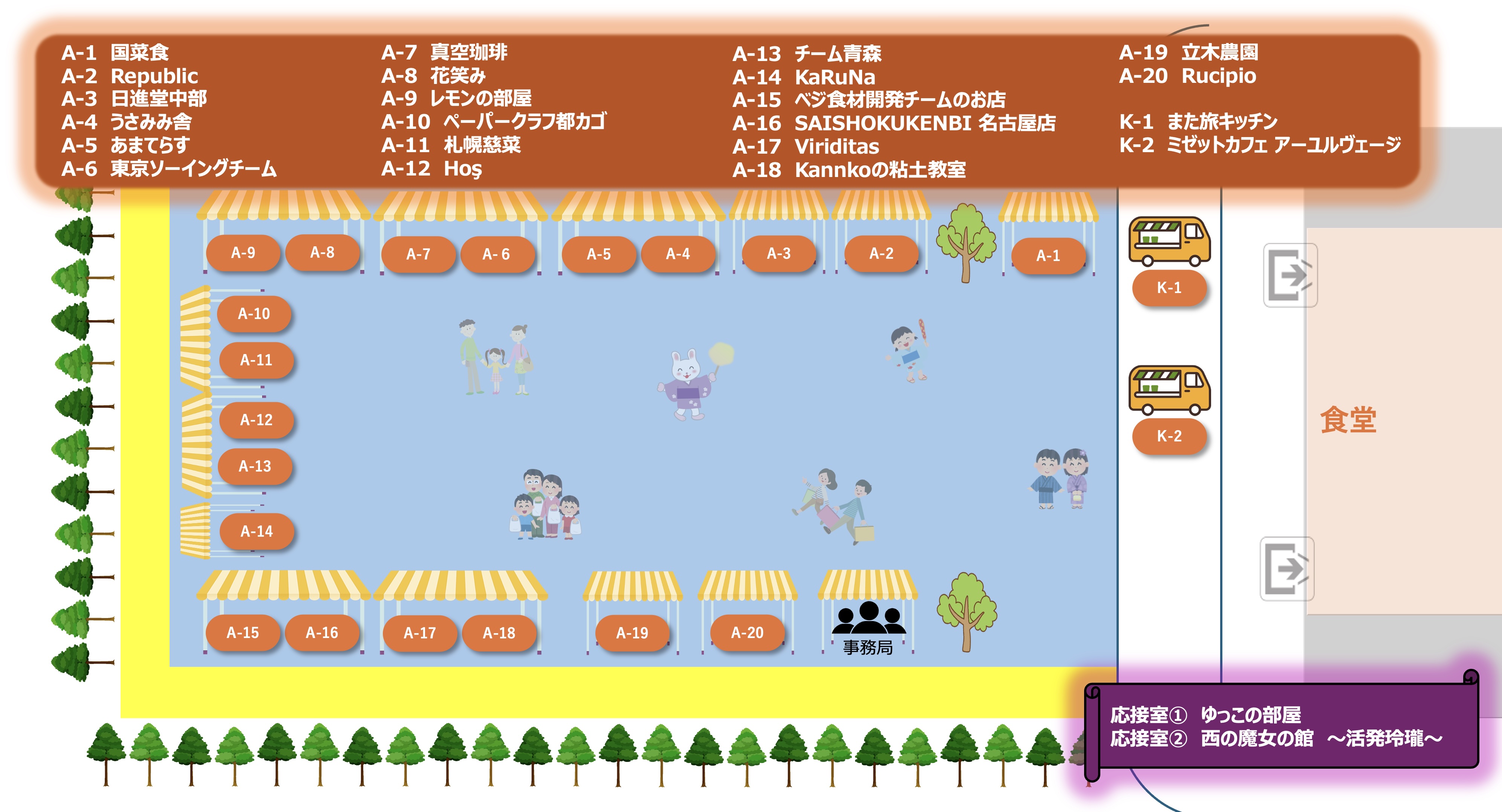 こだわりのベジフード、作り手の想いがこもった雑貨、 そして心温まる体験。 クリックして各ブースの魅力をご覧ください。